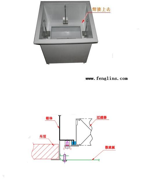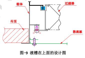 另外過濾器液槽位置的不同,也還是稍有一些差別。圖-3 所示的是液槽在高效過濾器下方的設計圖,液槽在高效上方的送風口設計見圖-9 所示。