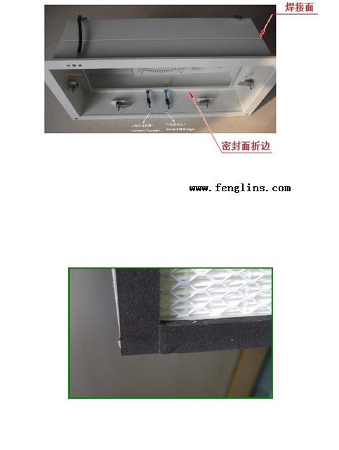 在送風口上 PAO 濃度檢測口(或發煙口)是貫穿高效過濾器上下游的(見圖-4 所示),所以它的泄漏就等于高效的泄漏。為此,康菲爾和昆山市 琺瑪德克采用的是進口成熟產品。在與框架的密封處,除放置丁基橡膠密 封墊外,還用硅膠來進一步的確保不泄漏。