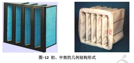 選用合適幾何形狀的初、中效過濾器(見圖-12),增加它的容塵兩,也能夠起到對高效過濾器的保護作用。有條件的還可以在中效后面加裝亞 高效過濾器,進一步的對高效過濾器加以保護。