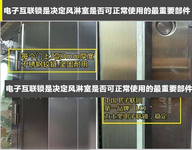 >>風(fēng)淋室雙門:材質(zhì)為全不銹鋼,上部帶3C認(rèn)證鋼化玻璃視窗,下部為不銹鋼平面處理,無凹凸棱角,減少死角;三道3MM厚度不銹鋼鉸鏈,保障門結(jié)實耐用,門與門框結(jié)合平整、牢固 、美觀,密封性能良好,門開啟靈活。