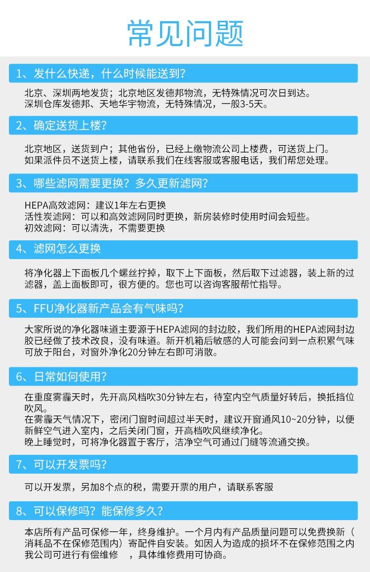 FFU空氣凈化器作為家電的一種,電機的問題,電源的問題等等,總會多多少少有所發生。而大部分小賣家都是借著這股風炒炒單,賣完就結束了,等您的凈化器出現問題,需要找人售后的時候,對不起,他們沒有能力也不會給您處理任何售后問題,至于承諾的三五年售后保障,那不過是放空炮沒有任何意義的承諾而已!找大廠家,行業經驗長的,您買的凈化器,不光是買的產品,更多的是買的服務。